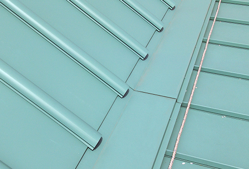 右記はそのような事例の建物で、屋根の上方は「たて葺きのラインを際立たせ」、下方では「防水性を重視した」低勾配で、屋根のラインも細かくしたいとの案件です。