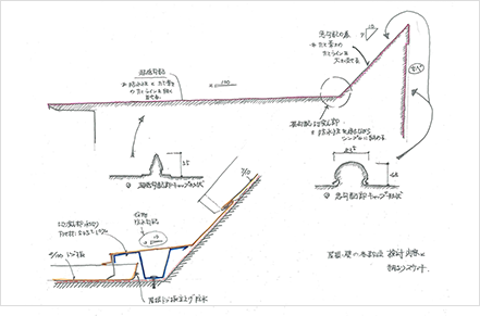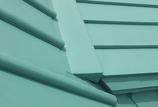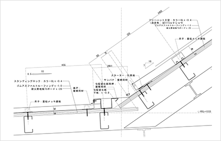 右記はそのような事例の建物で、屋根の上方は「たて葺きのラインを際立たせ」、下方では「防水性を重視した」低勾配で、屋根のラインも細かくしたいとの案件です。