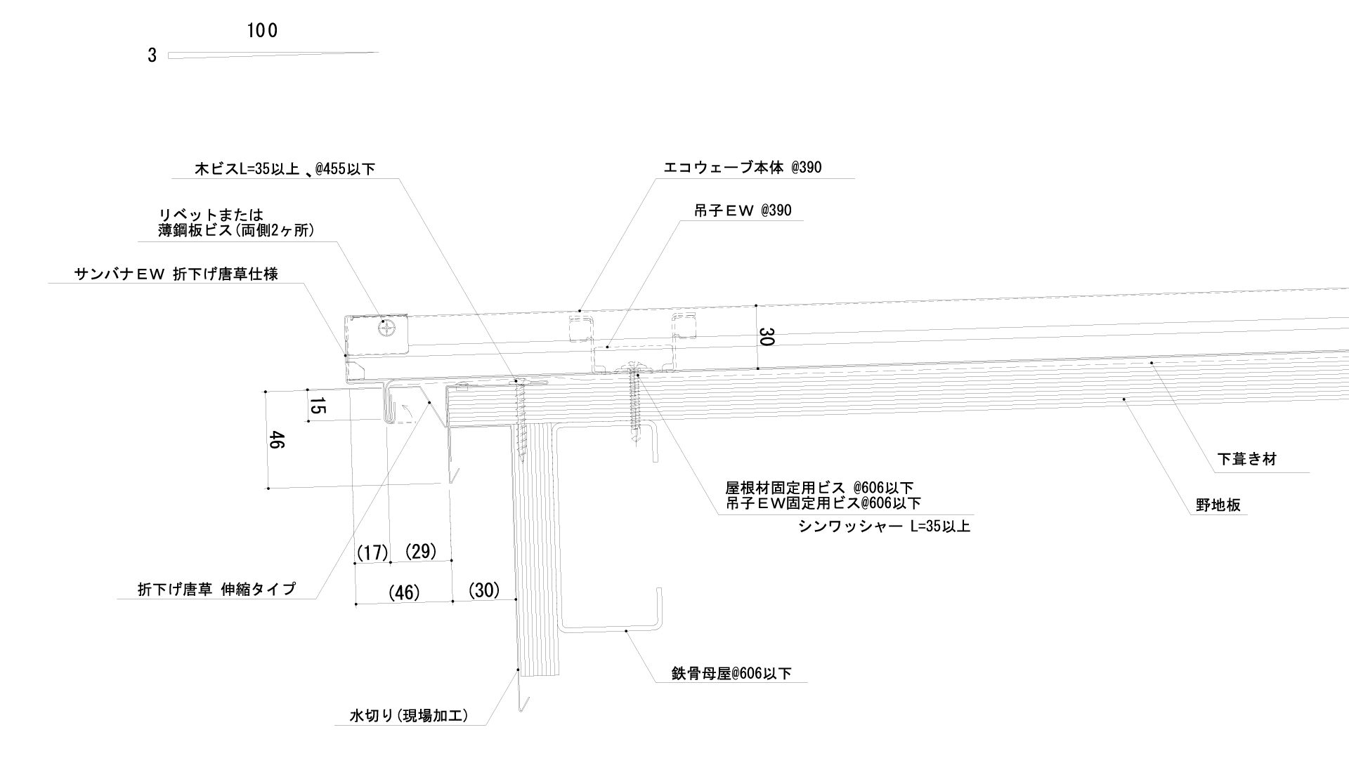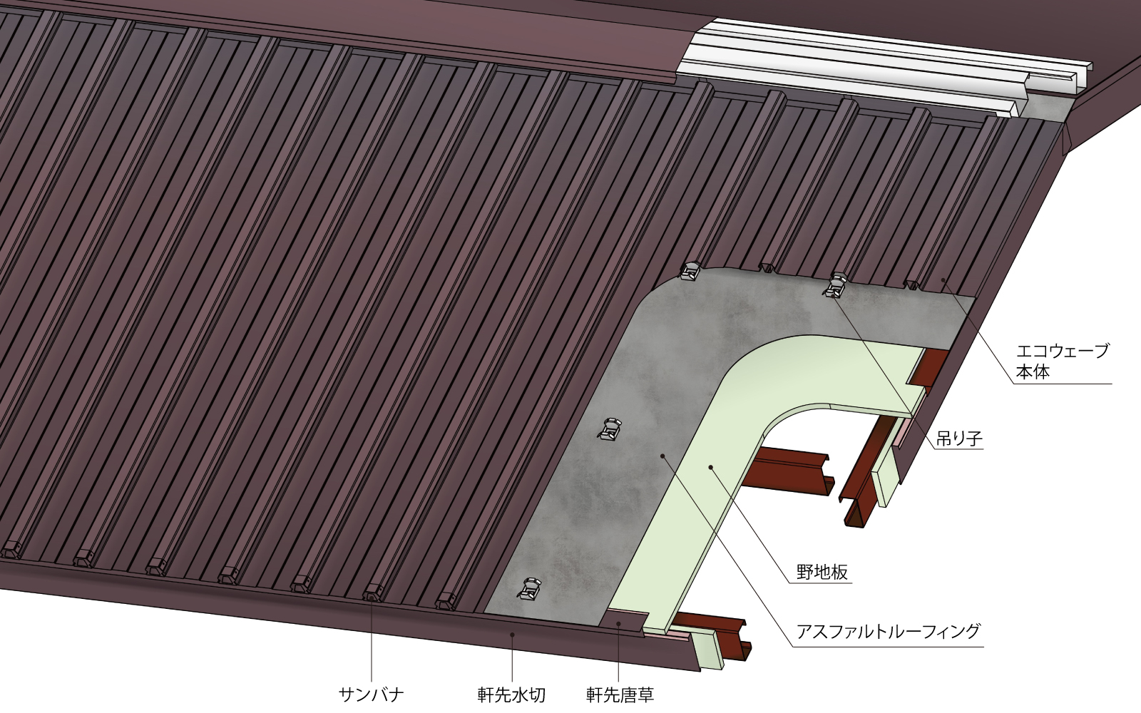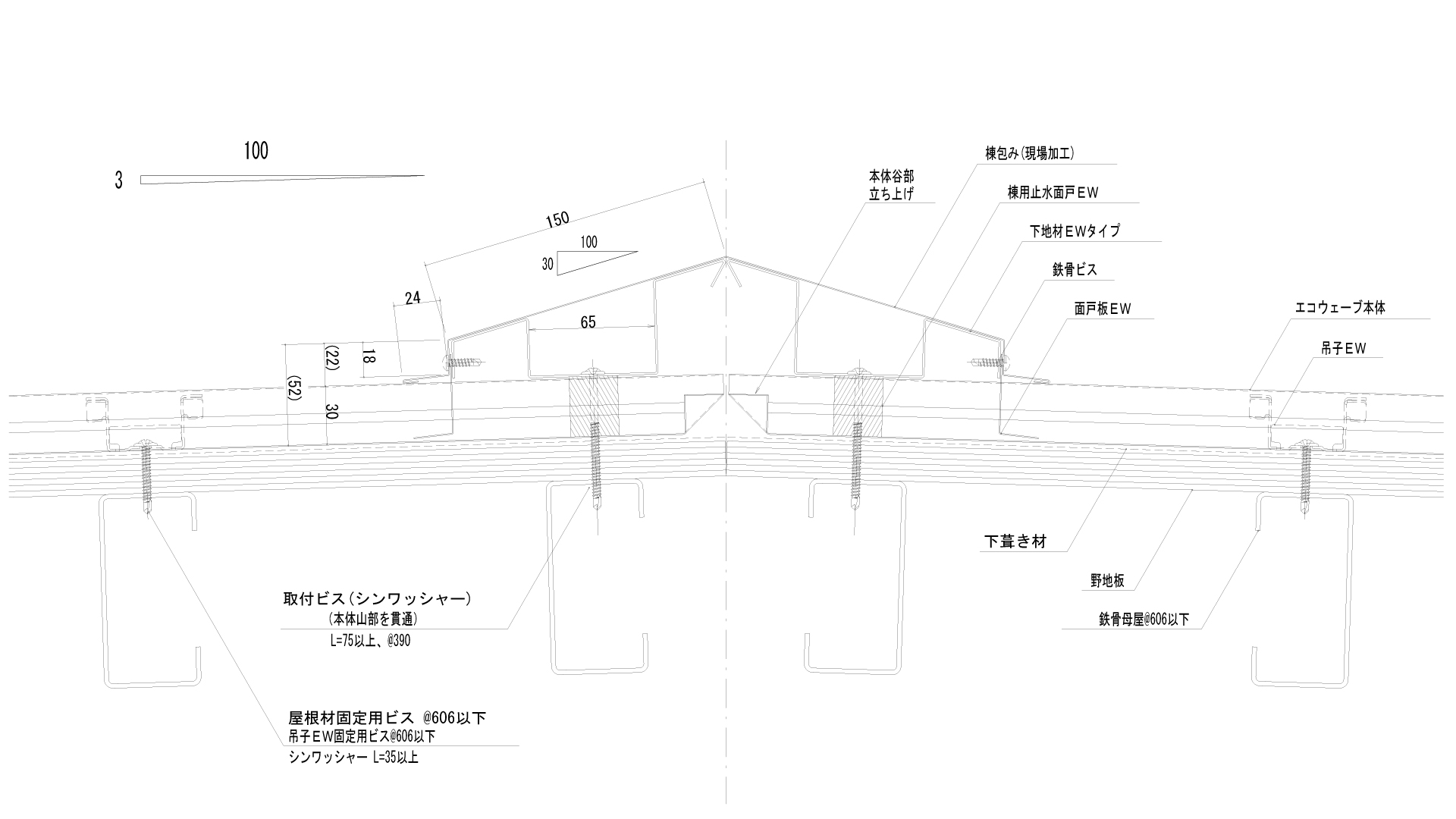 ドブ部に「縦リブ加工」を施し、屋根材の歪みを防止。