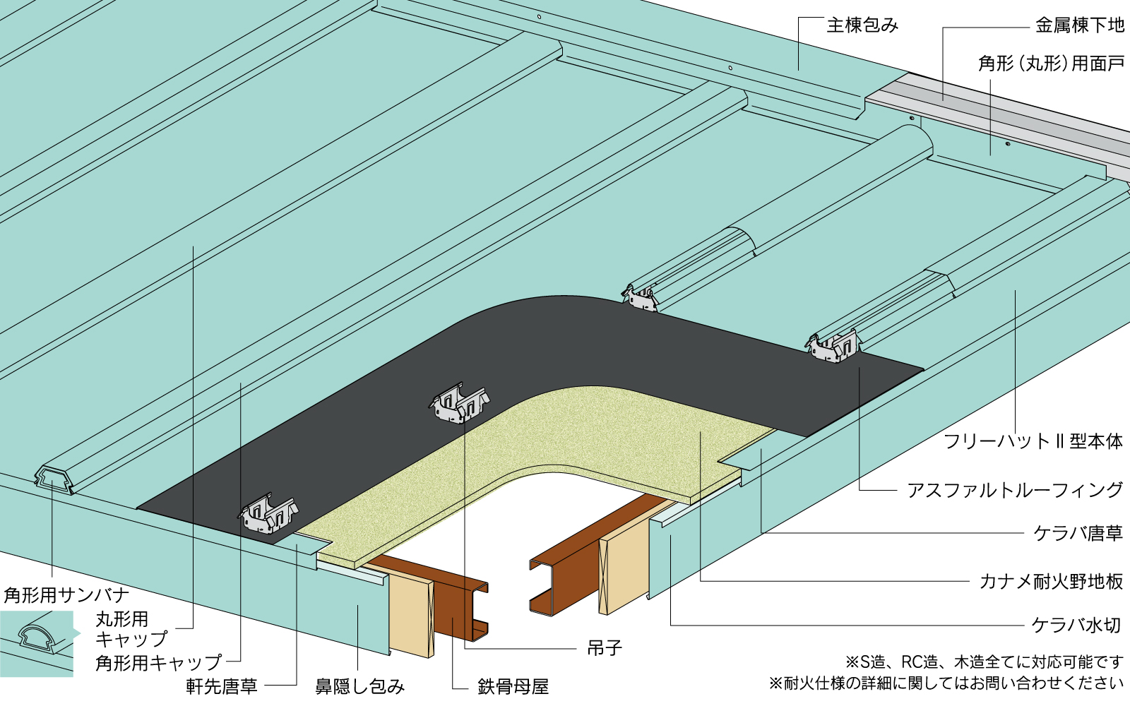 鋼板0.4mm 9m~ 鋼板0.5mm 8m~ 角形キャップはR不可 |