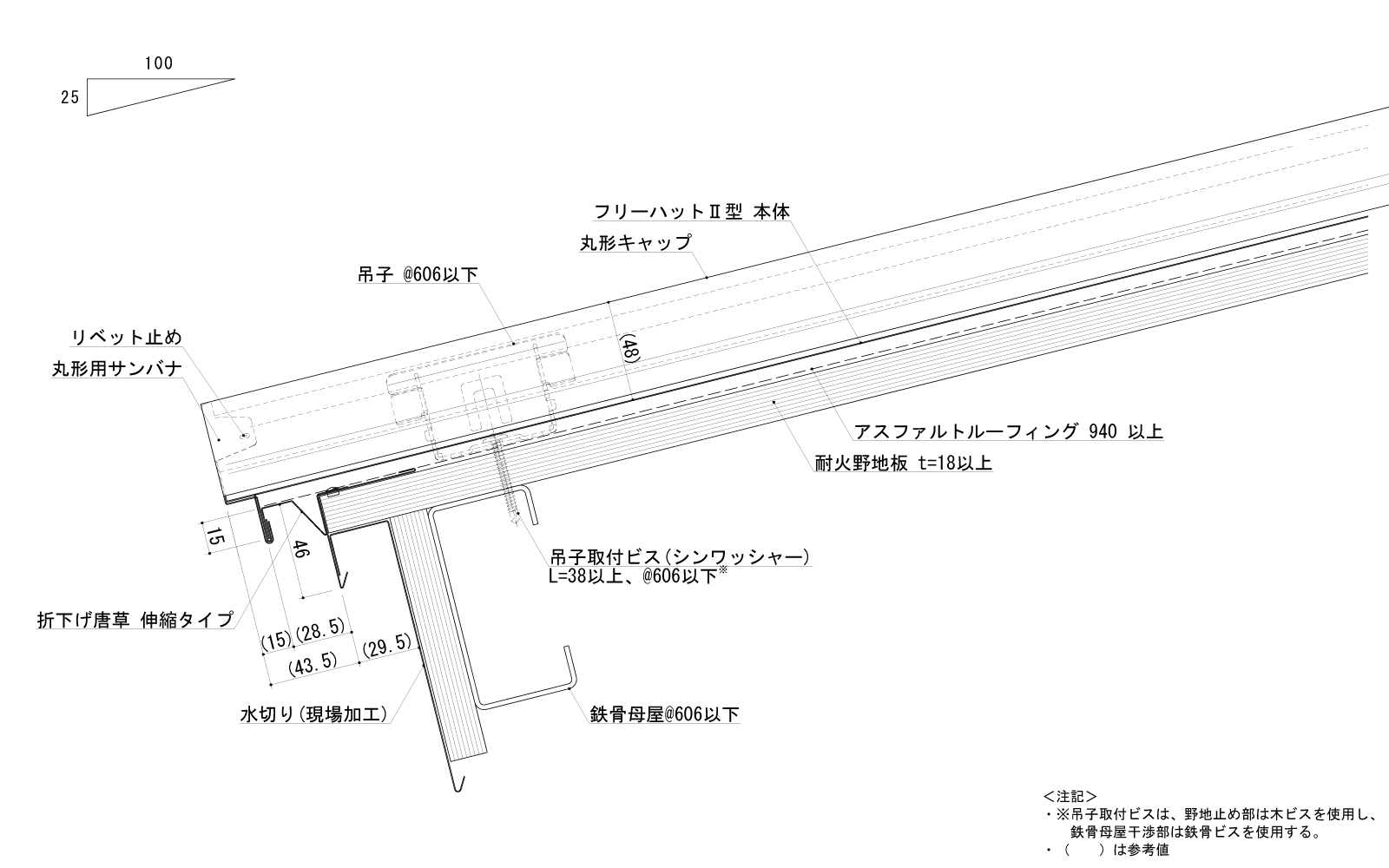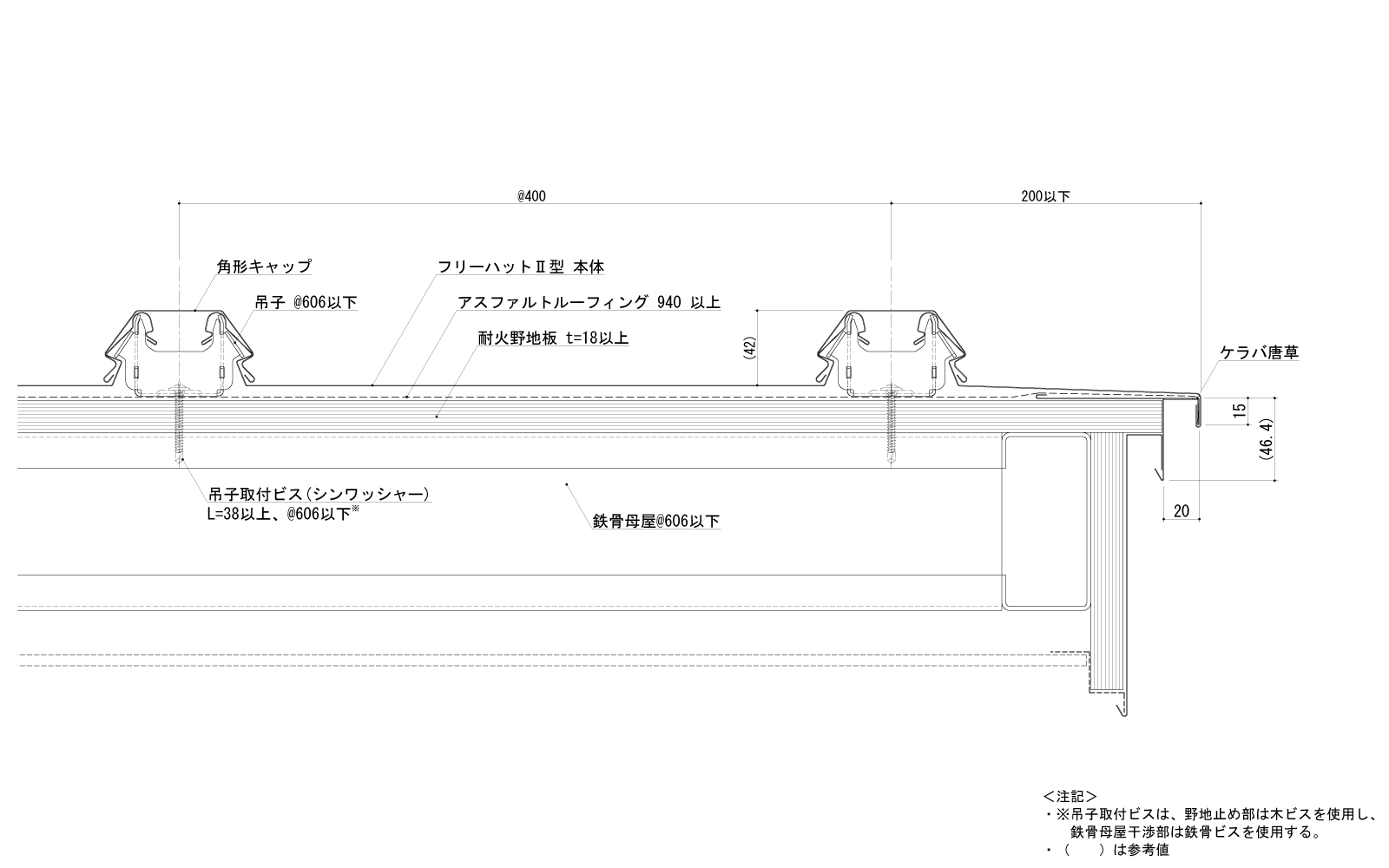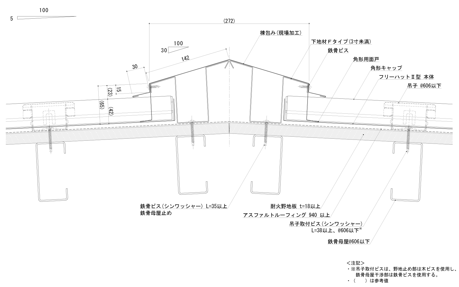 葺材【めっき鋼板製、又はステンレス鋼板製】・ポリスチレンフォーム板・硬質木片セメント板表張/ 軽量鉄骨下地屋根