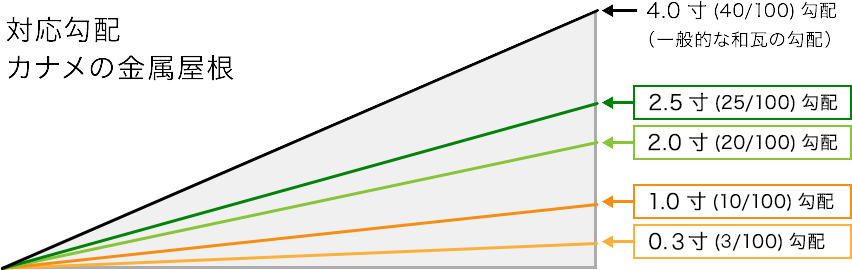 カナメの金属屋根(ガルバリウム鋼板、ステンレス、銅板など)は最小0.3寸勾配(3/100)の緩勾配から急勾配まで、全ての製品で高い水密性能を発揮しますので、特徴的な屋根から、逆に屋根を目立たせたくない場合、北側斜線への対応など、様々な建物、デザイン条件に幅広く対応が可能です。